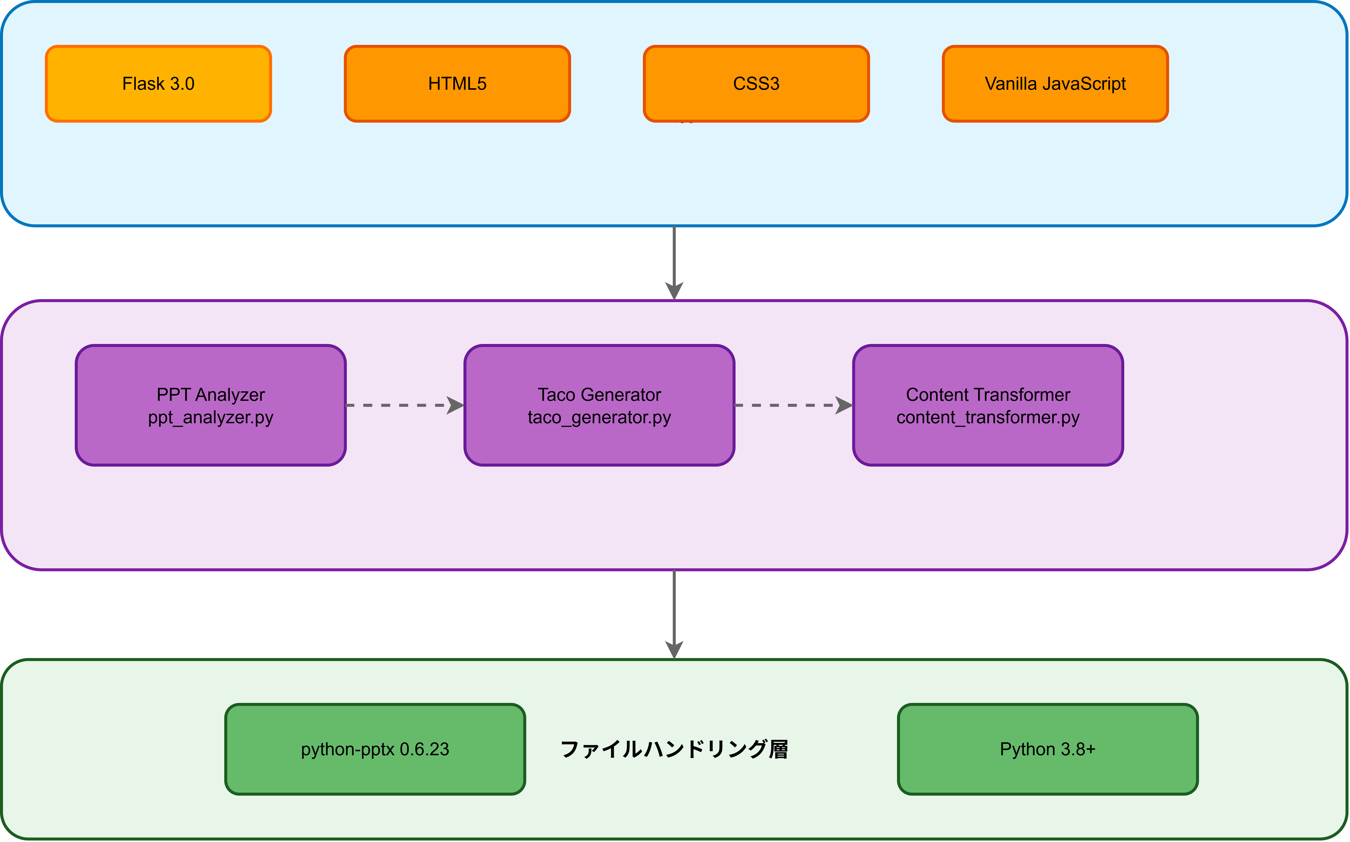 そこで本プロジェクトではアップロードされたPPTファイルを解析し、意図的にダサく独創的なデザインのスライド資料を作成することができるアプリケーションを製作しました。